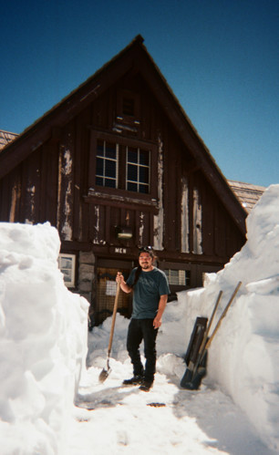 Outlaw country musician and Oregon resident Ty, shovelling snow at Crater Lake Lodge.